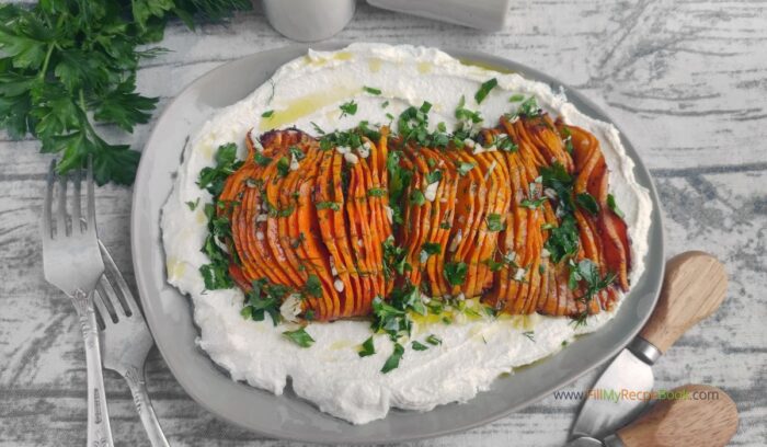 Roasted Hasselback Butternut Squash with cream cheese and garlic recipe. A delicious vegetable side dish for a family meal of lunch, dinner.