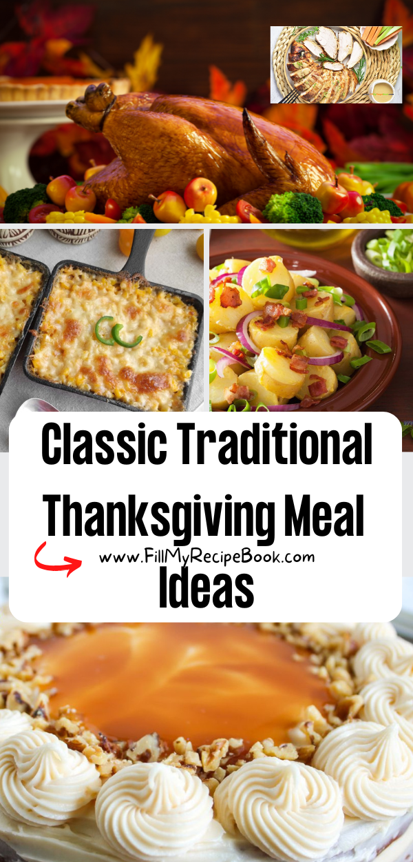 Impress your guests with these Typical Classic Traditional Thanksgiving meal recipes. Delicious food ideas, turkey, sides and dessert.