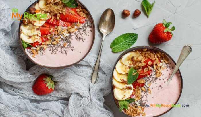A Healthy Strawberry Banana Smoothie Bowl recipe idea for a quick and filling breakfast with Greek yogurt and granola sweetened with honey.