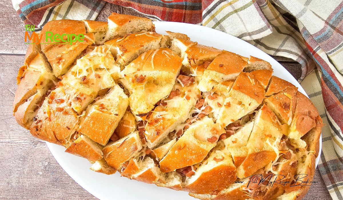 Savory Bacon Cheese Pull Apart Bread (3) Savory Bacon Cheese Pull Apart Bread recipe. Simple appetizer or starter to bake with a ready made loaf of bread, using garlic and butter.